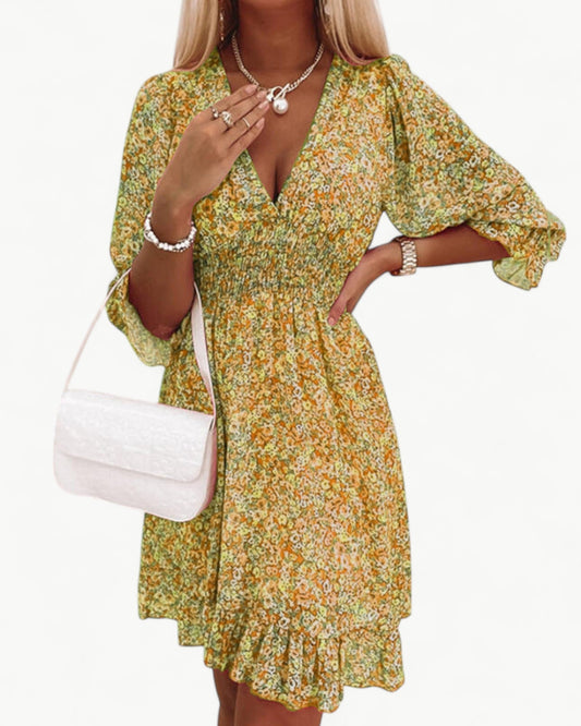 LÉONIE – Blommig klänning med smock & volangdetalj