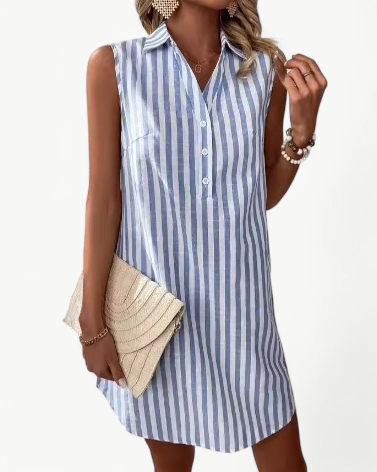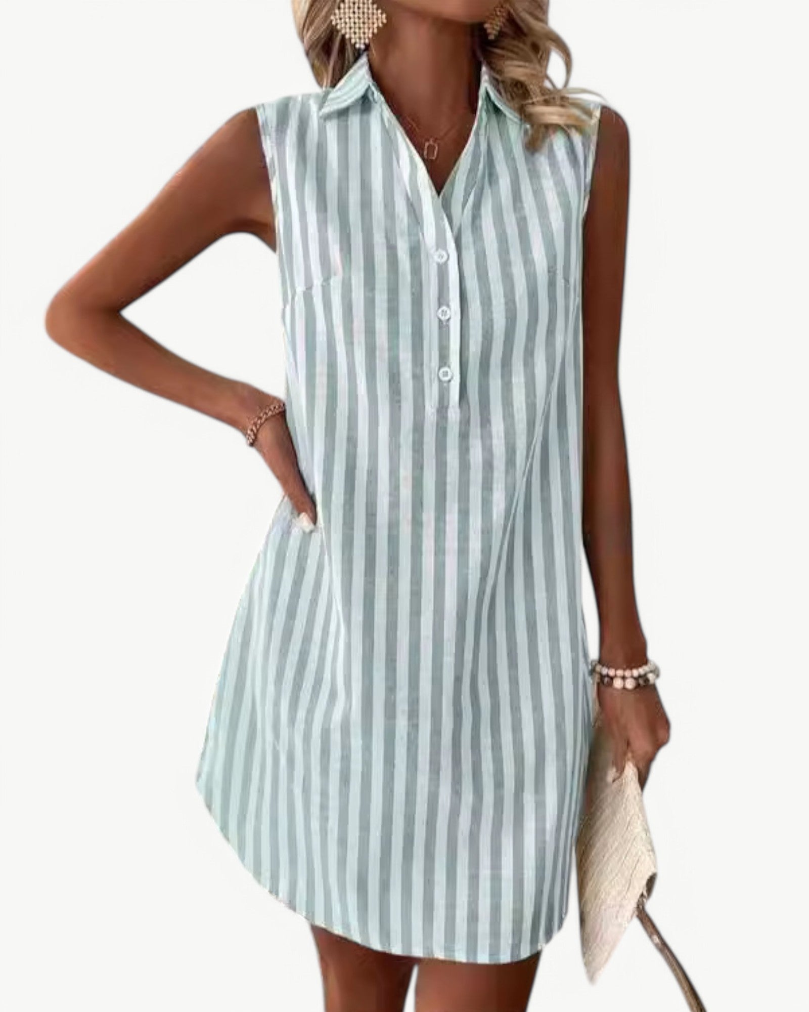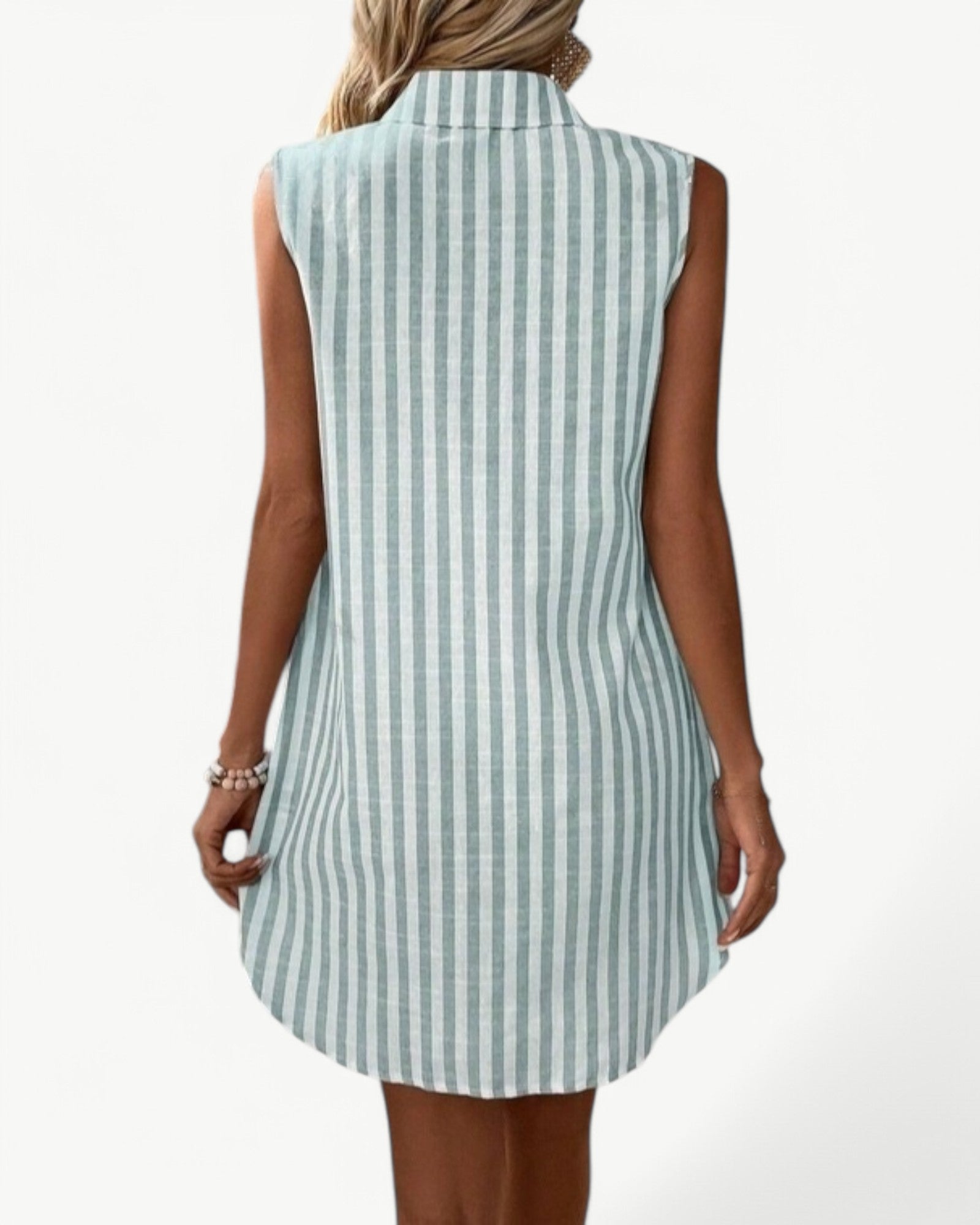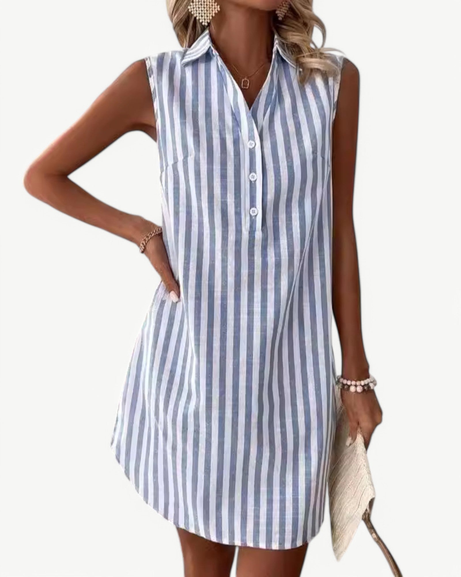 En avslappnad och stilren skjortklänning i ärmlös design med vertikala ränder, knappslå och krage. Perfekt för varma dagar när du vill ha en luftig och enkel look med en klassisk touch.