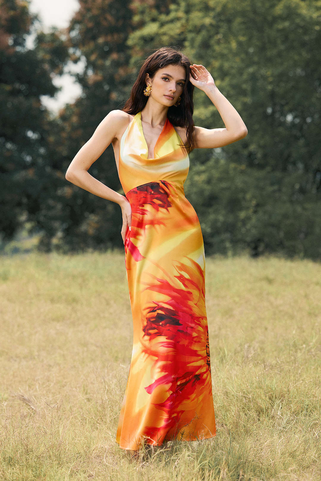 Vestido largo de satén VALENTINA con estampado floral y cuello halter, cuello alto, espalda descubierta y sin mangas.