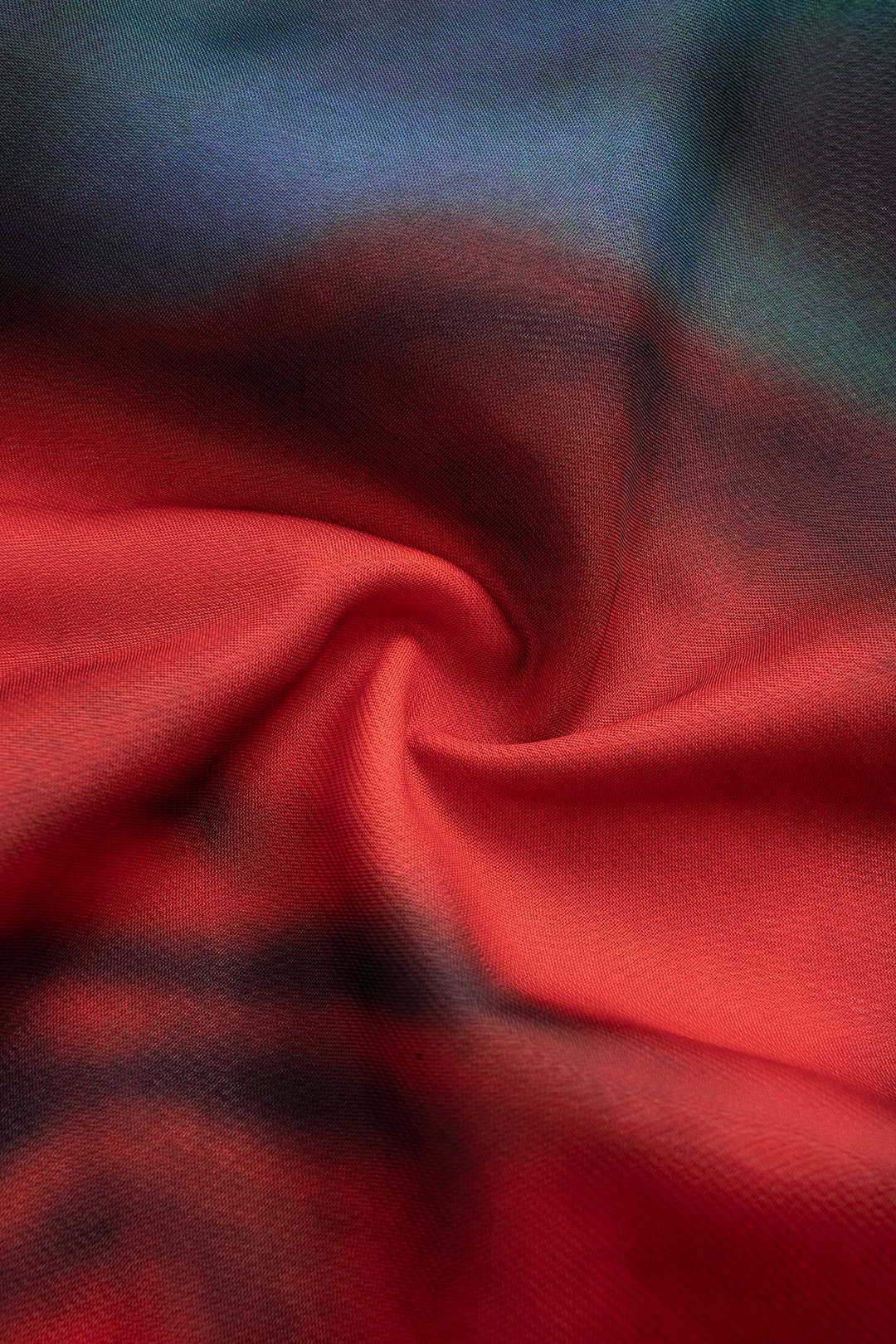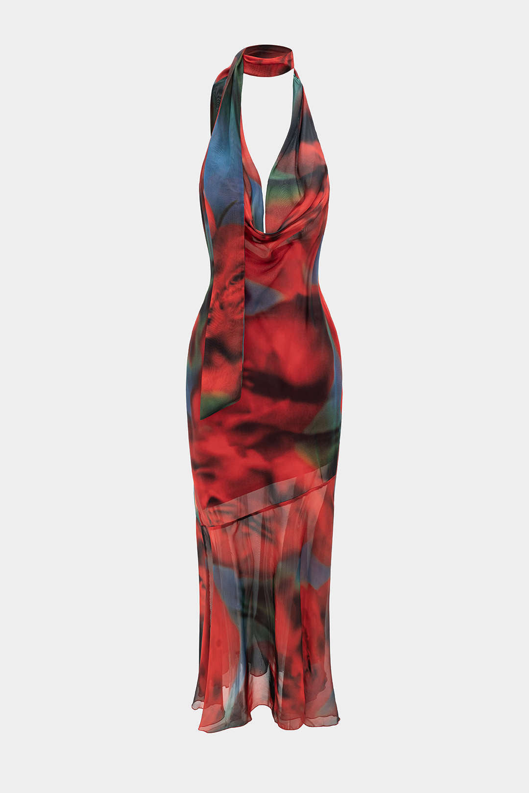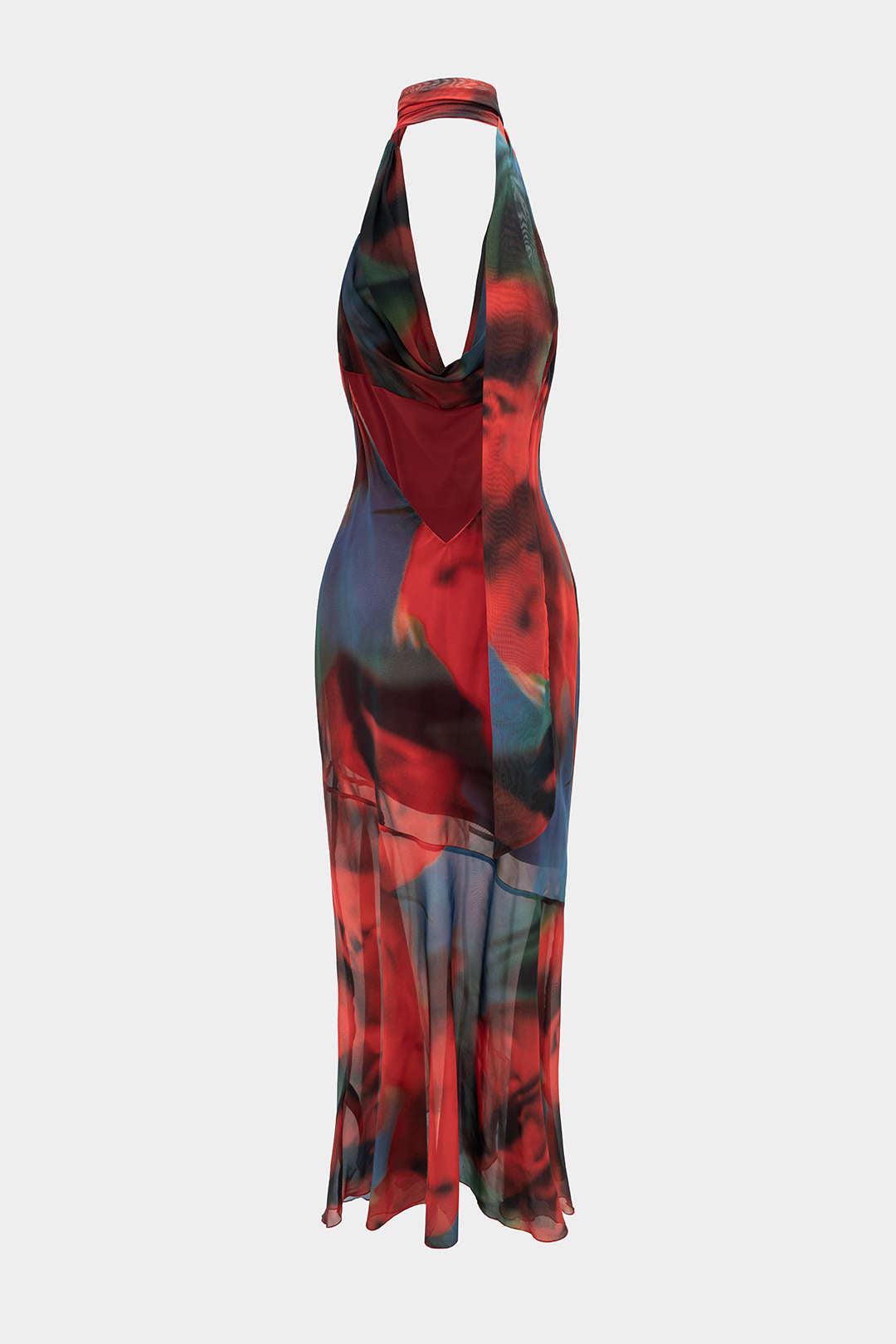 Vestido largo AITANA, sin mangas de cuello alto con cuello halter y estampado floral abstracto de malla.