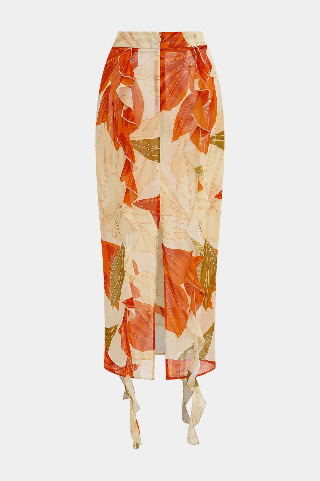 Patrón de hojas de gasa con cuello en V, volantes, top de manga larga y falda con abertura