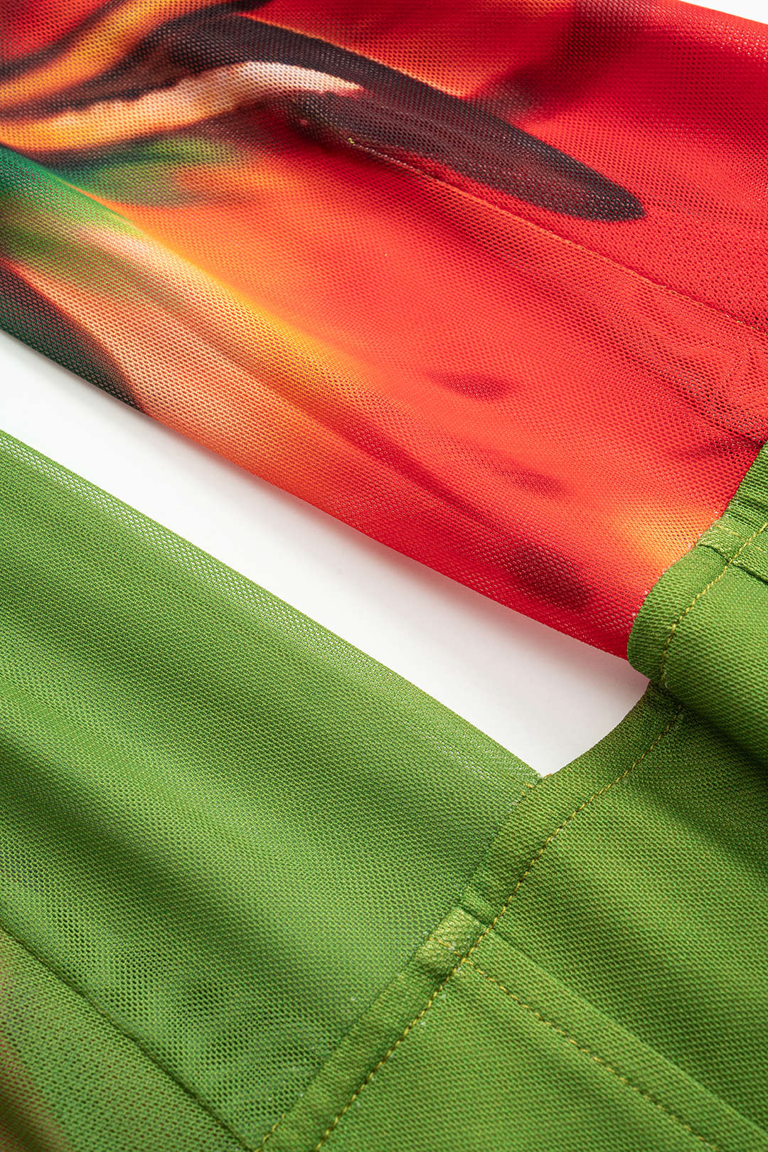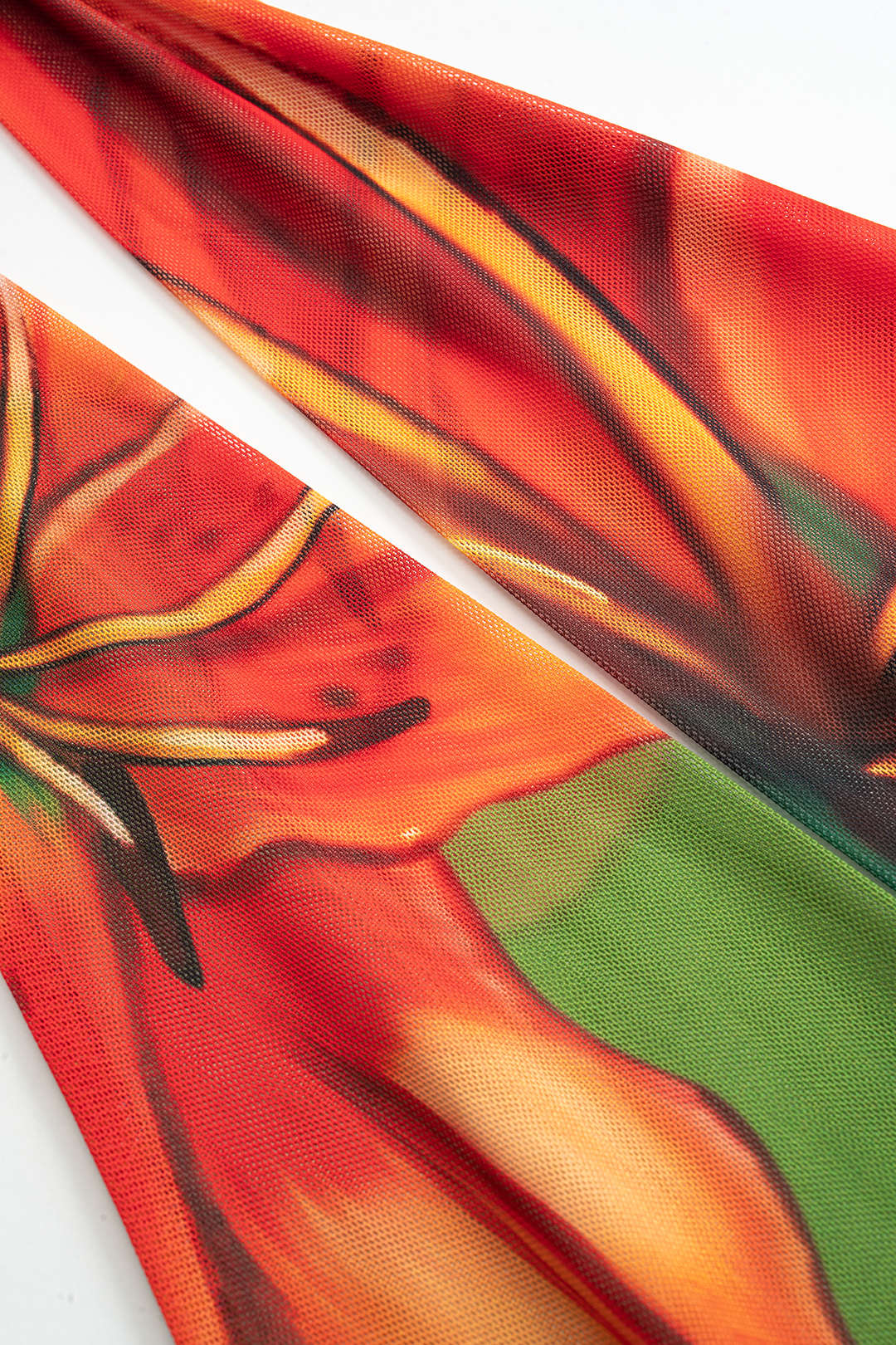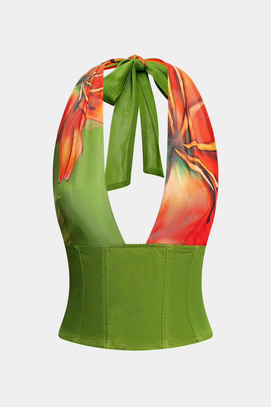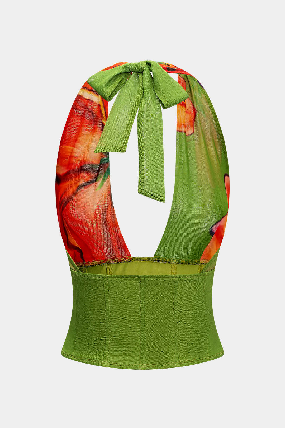 GABRIELA, top camisola de malla con estampado floral y cuello halter, cuello en V y espalda descubierta.