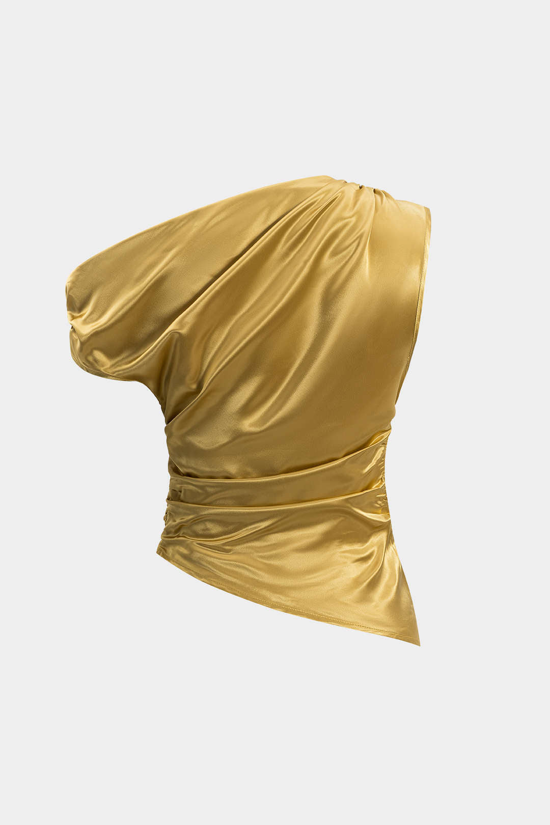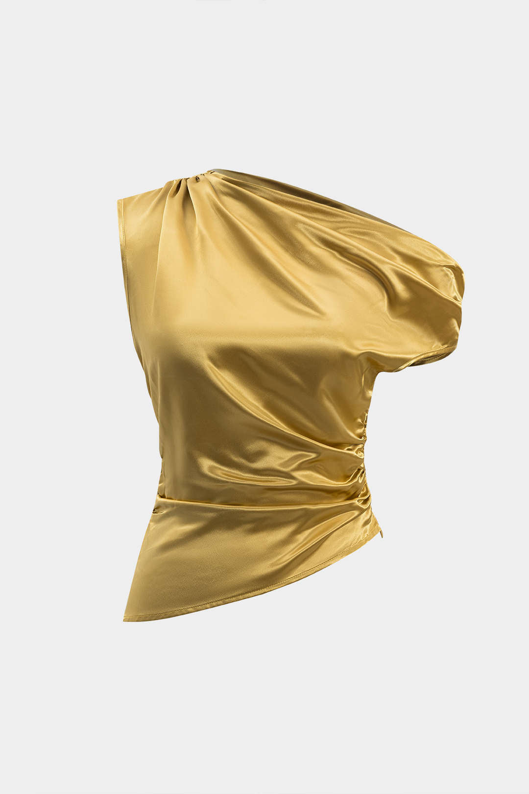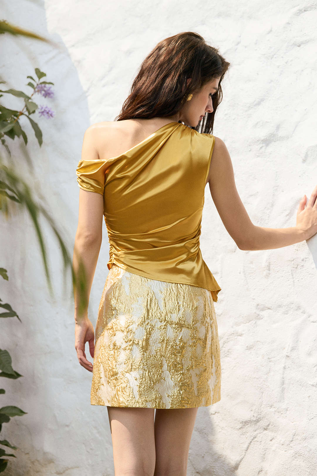 CAYETANA, camiseta sin mangas con volantes asimétrico de satén.