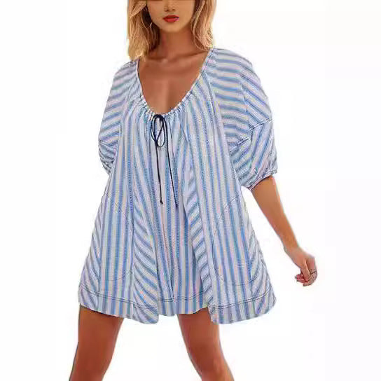 En luftig och stilren jumpsuit i kort modell med voluminösa ärmar, v-ringning med knytband och lekfullt randigt mönster. Perfekt för varma dagar, semester och avslappnade stunder – finns i flera färger.
